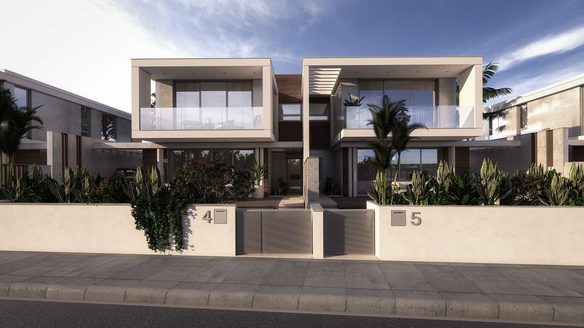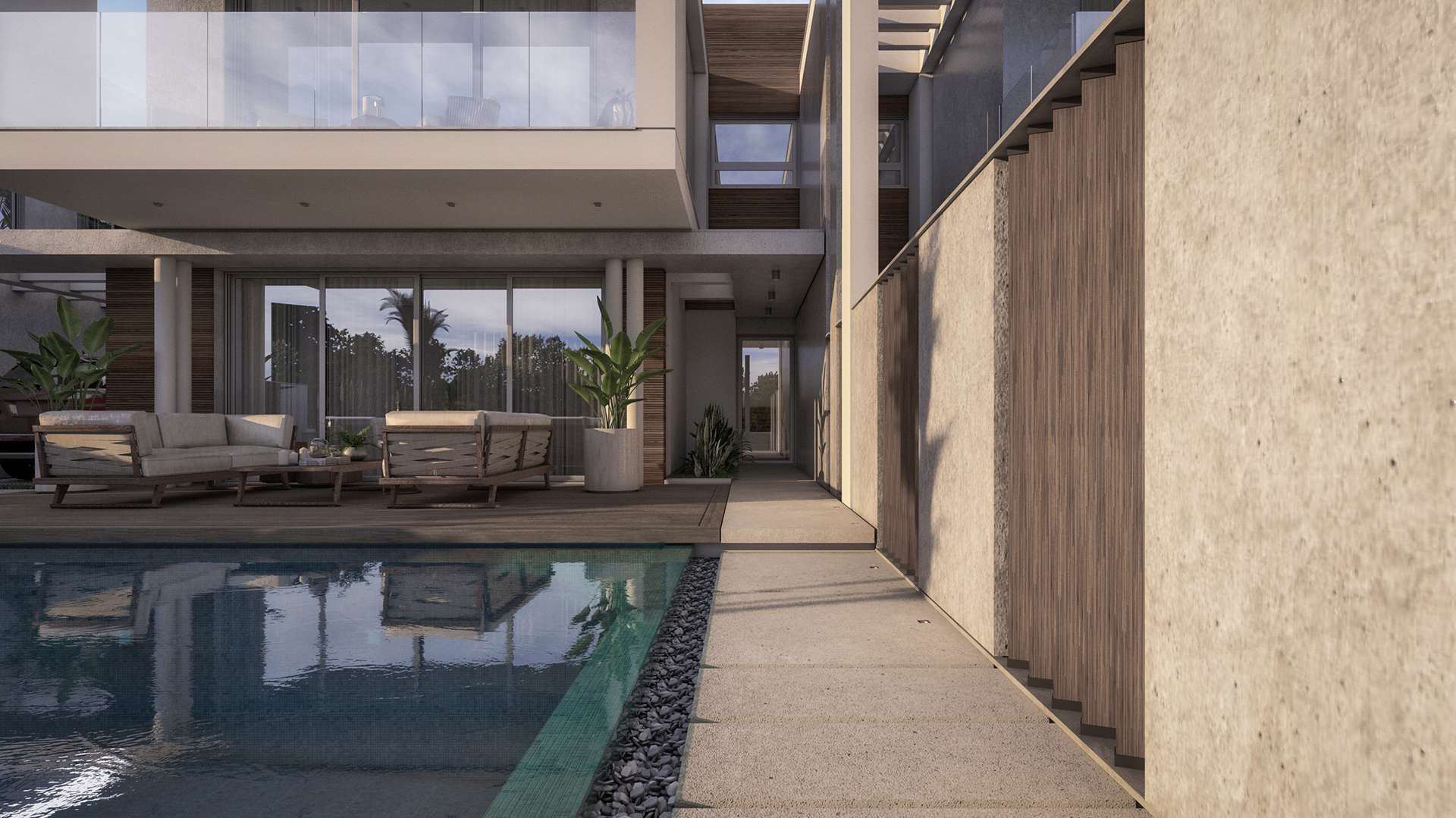 A recent proposal that IDcy prepared for a developer consists of a series of duplex houses, each outfitted with a swimming pool, 4 Bedrooms and 3 Bathrooms over 165 sq.m. Slight differentiations to the overhanging building volumes and foliage ensure that otherwise identical houses do not feel repetitive, creating secluded courtyards for every resident. The interior spaces are designed in an elegant, neutral palette to maximize flexibility for potential buyers, while simultaneously accentuating the relationship with the exterior.